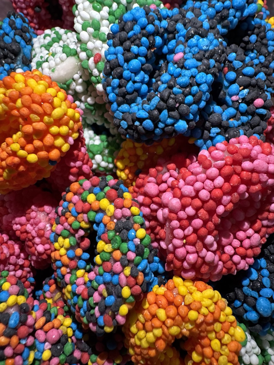 Zucker, Glukosesirup, Wasser, Reismehl, Gelatine, Säuerungsmittel: Apfelsäure (E296), Zitronensäure (E330), Stabilisator: Natriumhydrogenmalat (E350ii), Überzugsmittel: Gummi arabicum (E414), Aromen, Farbstoffe: Tartrazin (E102), Carmoisin (E122), Allurarot AC (E129), Brillantblau FCF (E133), Aktivkohle (E153).