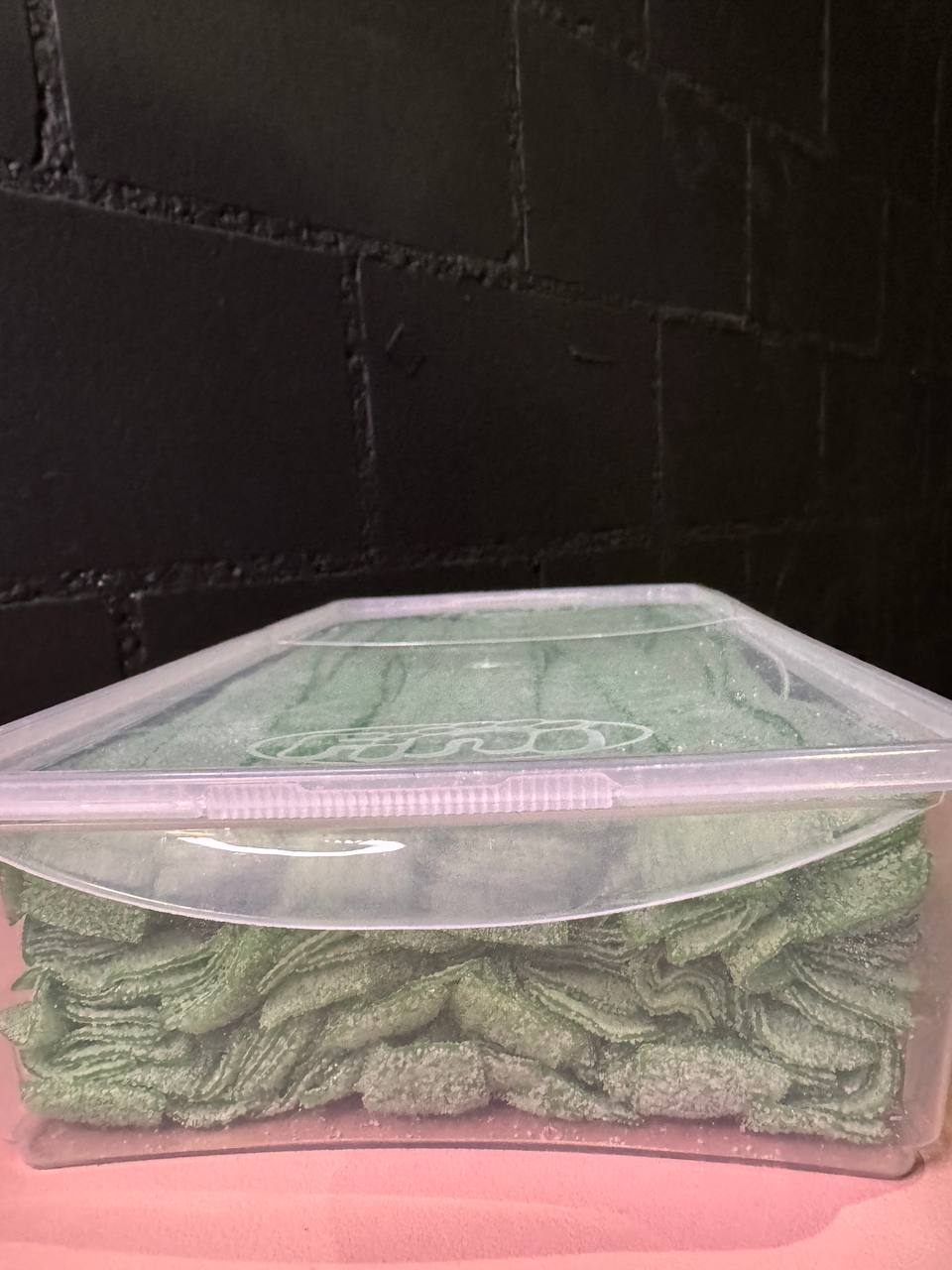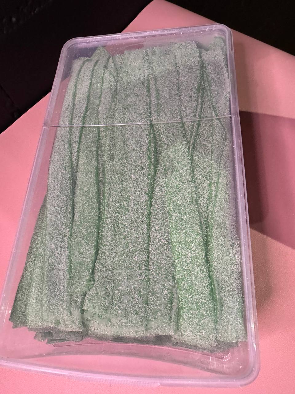Zutaten: Glukose-Fruktose-Sirup, Zucker, Weizenmehl, Stärke, Säureregulatoren E296, E330, E270, Palmfett, Säureregulatoren E325, E331, Salz, Emulgator E471, Aromen, Feuchthaltemittel E422, Farbstoffe E100, E133.