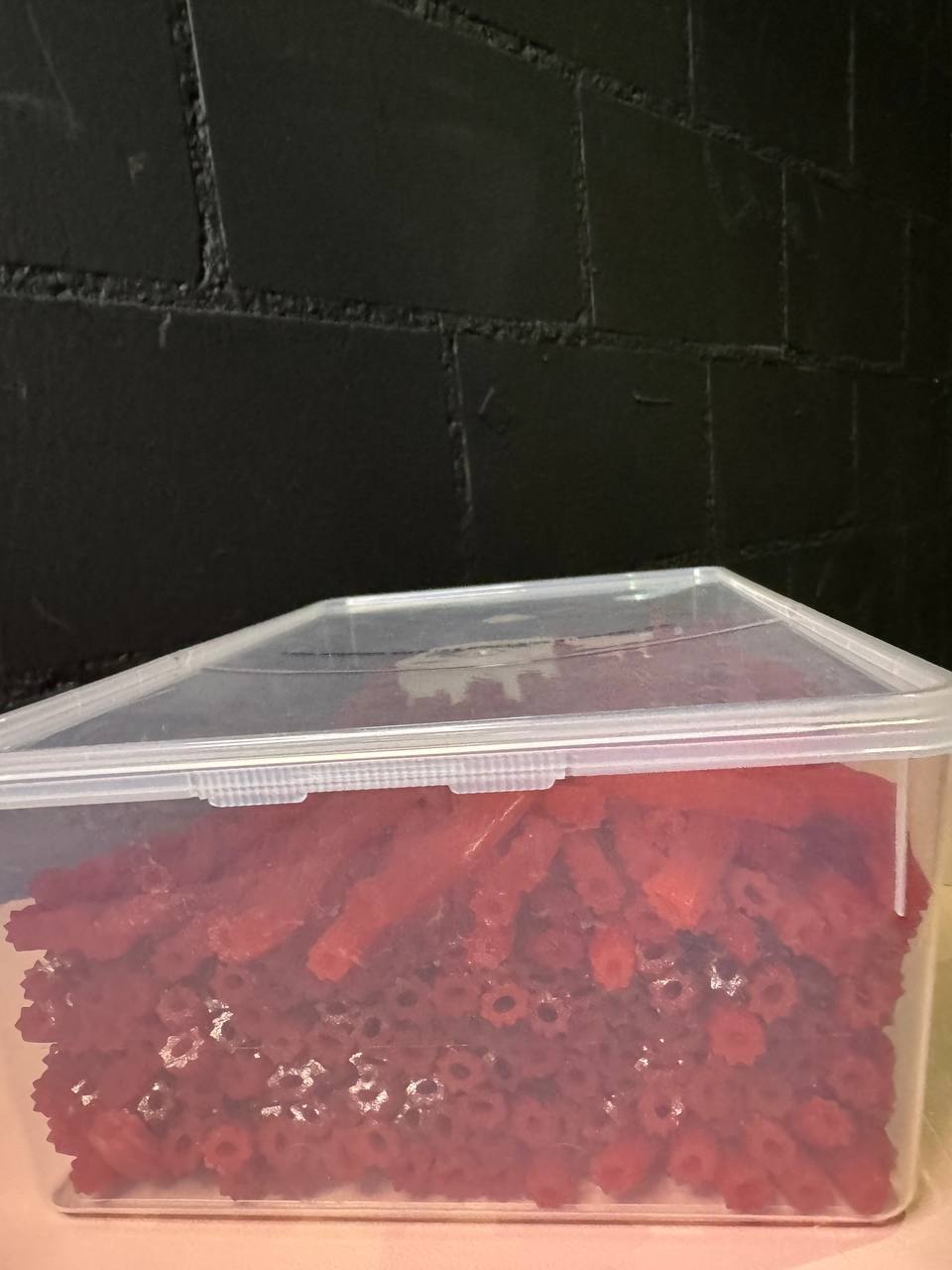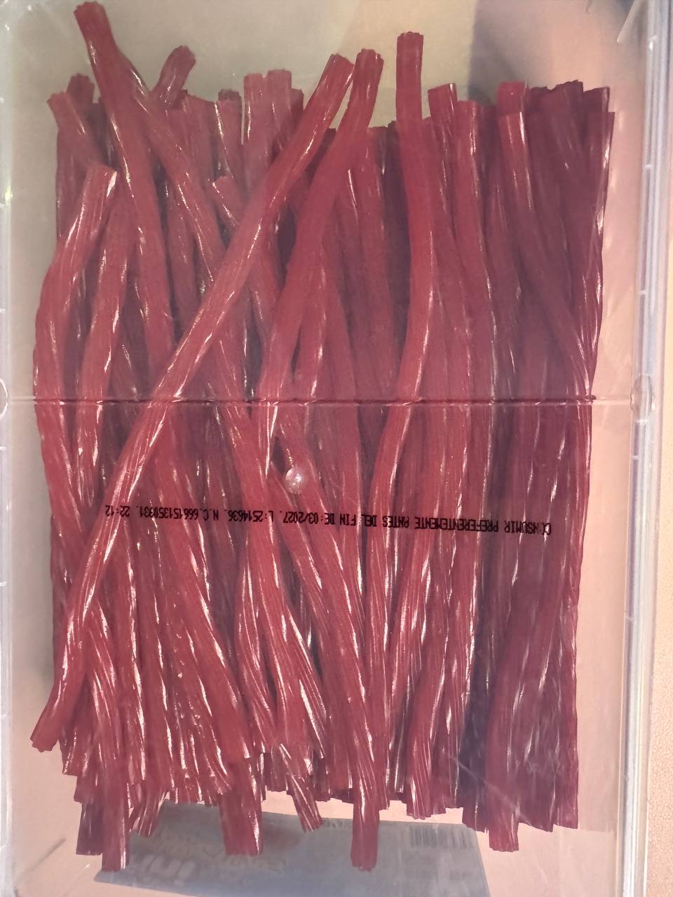 Zutaten: Glukose-Fruktose-Sirup, Weizenmehl, Zucker, Palmöl, Kokosnuss, Säureregulatoren E330, E270, Säureregulatoren E325, E331, Salz, Emulgator E471, Aromen, Feuchthaltemittel E422, Farbstoff: E129 (E129 kann Aktivität und Aufmerksamkeit bei Kindern beeinträchtigen).