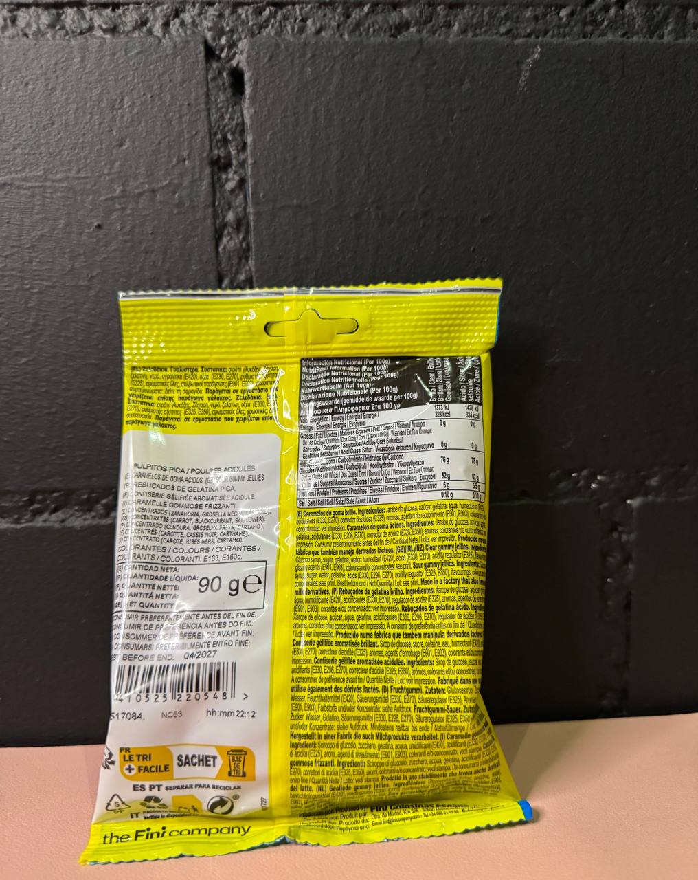 Zucker, Glukosesirup, Wasser, Gelatine, Säuerungsmittel (E330, E296, E270), Säureregulatoren (E325, E350), Aromen, Farbstoffe (E133, E160c), Karotten-, Johannisbeer- und Saflorkonzentrat.