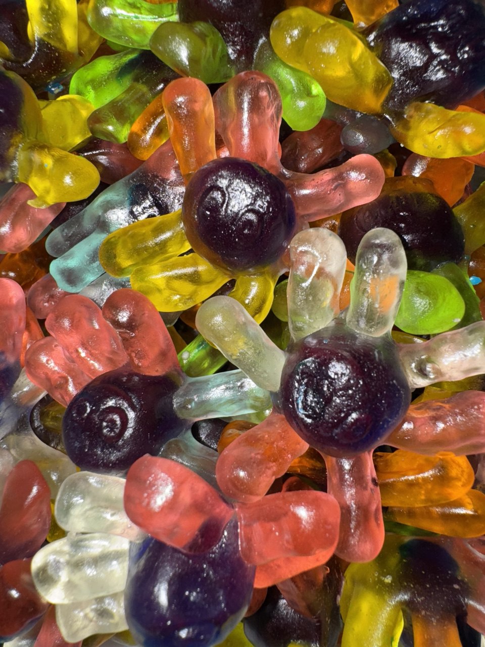 Zutaten: Glukosesirup, Zucker, Wasser, Gelatine, Feuchthaltemittel (E420), Geliermittel (acetylierte Stärke), Säuerungsmittel (E330), Geliermittel (Pektin), Säuerungsmittel (E270), Säureregulator (E325), Aromen, Überzugsmittel (E901, E903), Farbstoffe: E102, E110, E129, E133.