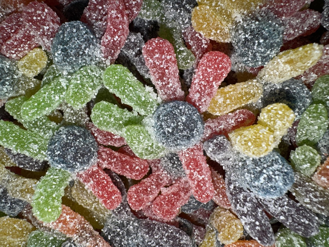 Zutaten: Glukosesirup, Zucker | Wasser | Gelatine | Dextrose | Säuren: E330, E296, E270 | Säureregulator E325 | Aromen | Farbstoffe: E102, E110, E129, E133.