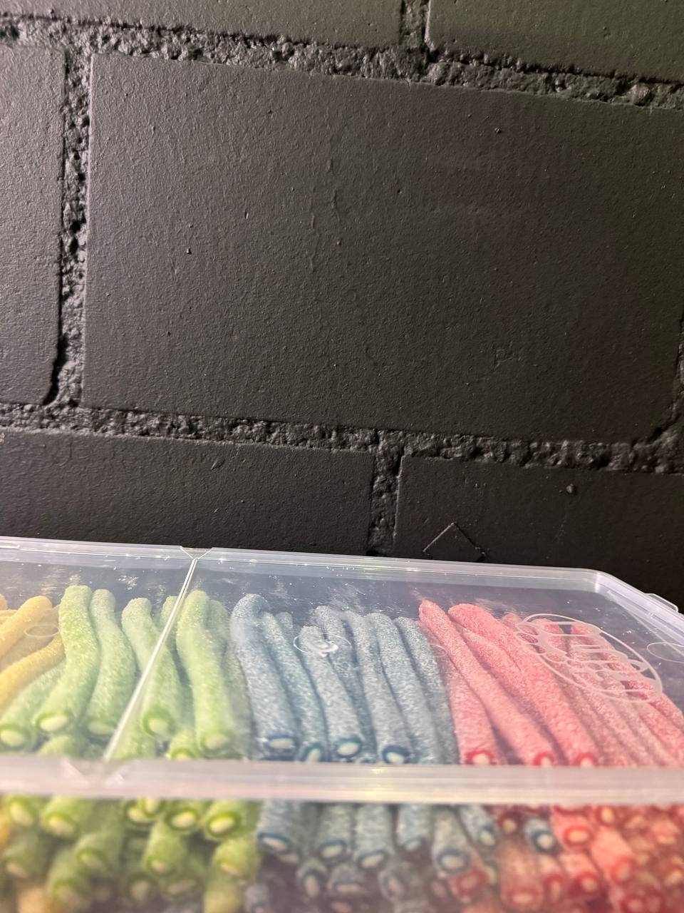 Zutaten: Zucker, Glukose-Fruktose-Sirup, Weizenmehl (Gluten), Säuerungsmittel (E296), Stärke, Pflanzenfett (Palm), Säuerungsmittel (E270, E330), Gelatine, Aromen, Säureregulatoren (E325, E331), Feuchthaltemittel (E422), Salz, Emulgator (E471), Farbstoffe: E102, E129, E133.