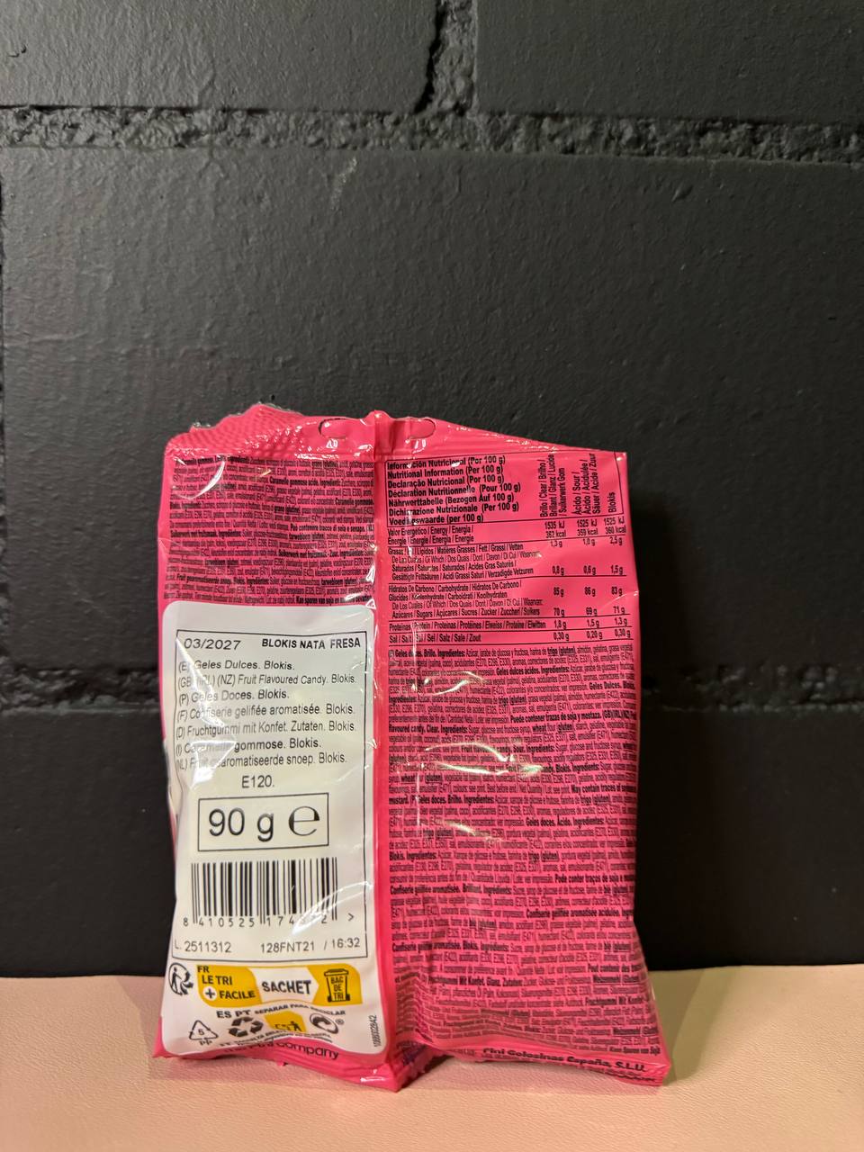 Zucker, Glukose-Fruktose-Sirup, Weizenmehl (Gluten), Pflanzenfett (Palm), Stärke, Feuchthaltemittel (E422), Säuerungsmittel (E330, E296, E270), Gelatine, Säureregulatoren (E325, E331), Aromen, Salz, Emulgator (E471), Farbstoff: E120.