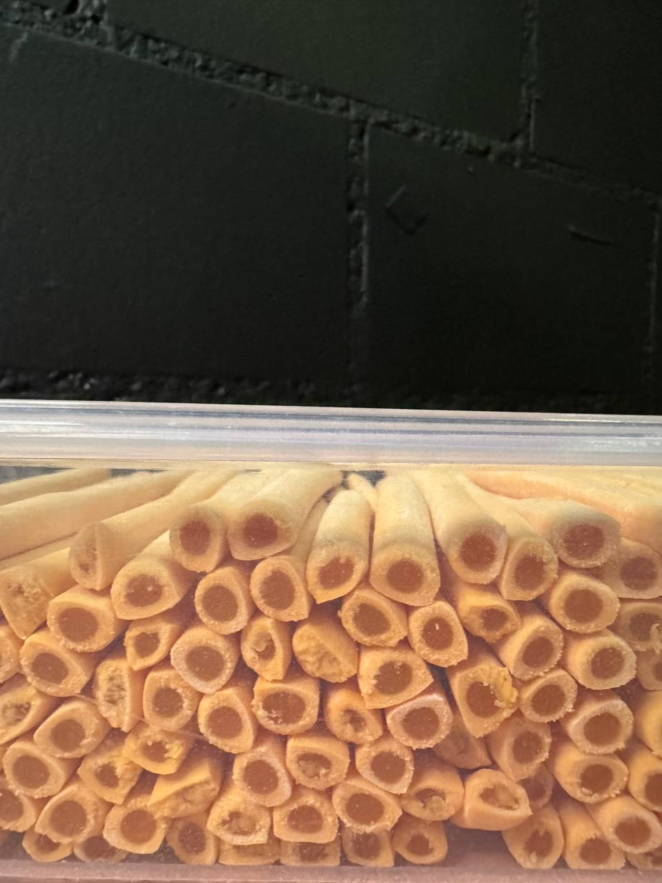 Zutaten: Zucker, Glukose-Fruktose-Sirup, Weizenmehl (Gluten), Stärke, Gelatine, Pflanzenfett (Palm, Kokosnuss), Pflanzenöl (Palm, Kokosnuss), Säuerungsmittel (E270, E296, E330), Aromen, Säureregulatoren (E325, E331), Salz, Emulgator (E471), Feuchthaltemittel (E422), Farbstoffe: E100, E120, E160c.