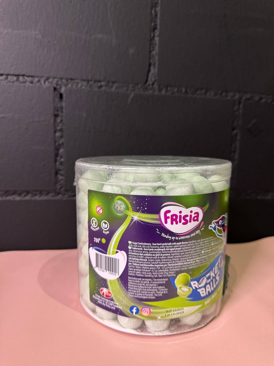 Zutaten: Zucker, Glukosesirup, Dextrose, Säuerungsmittel (E330, E296), Aroma (Apfel), Farbstoff (E141).
