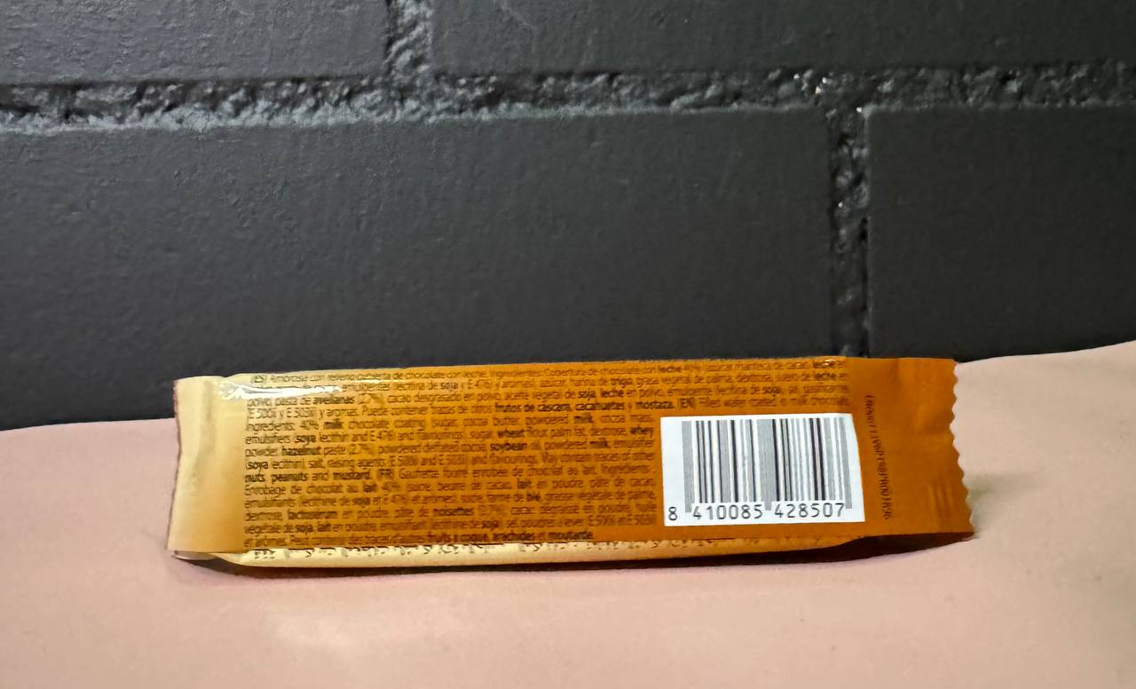 Zutaten: 40 % Milchschokoladenüberzug (Zucker, Kakaobutter, Milchpulver, Kakaomasse, Emulgatoren (Sojalecithin und E 476) und Aromen), Zucker, Weizenmehl, Palmfett, Dextrose, Molkenpulver, Haselnusspaste (2,7 %), fettarmes Kakaopulver, Sojaöl, Milchpulver, Emulgator (Sojalecithin), Salz, Backtriebmittel (E 500ii und E 503ii) und Aromen. Kann Spuren von Erdnüssen, Senf und anderen Nüssen enthalten.