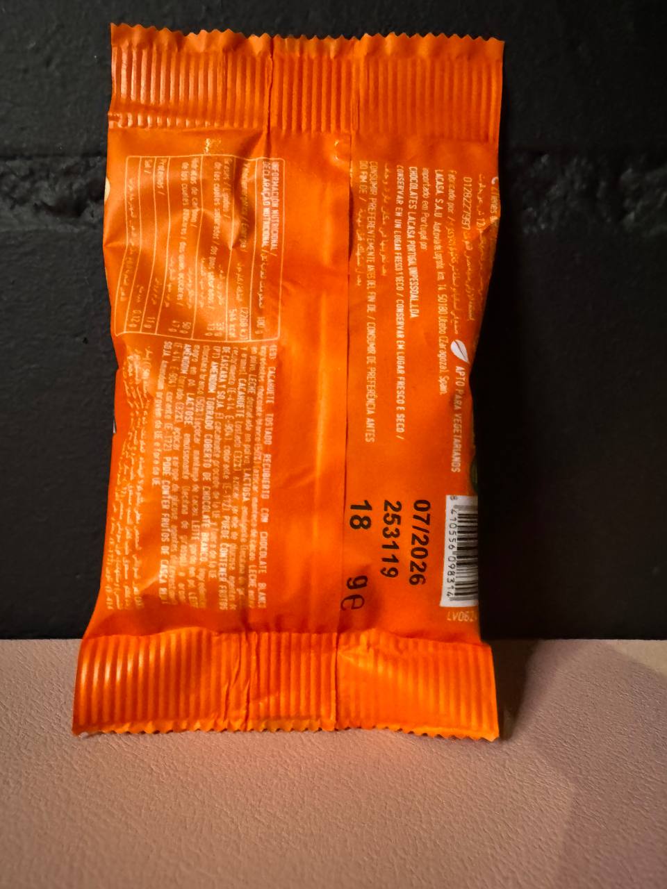Zutaten: Weiße Schokolade (50 %) (Zucker, Kakaobutter, Vollmilchpulver, Magermilchpulver, Laktose, Emulgator (Sonnenblumenlecithin) und Aromen) | geröstete Erdnüsse (32 %) | Zucker | Glukosesirup | Überzugsmittel (E-414, E-904) | Farbstoff (E-172).