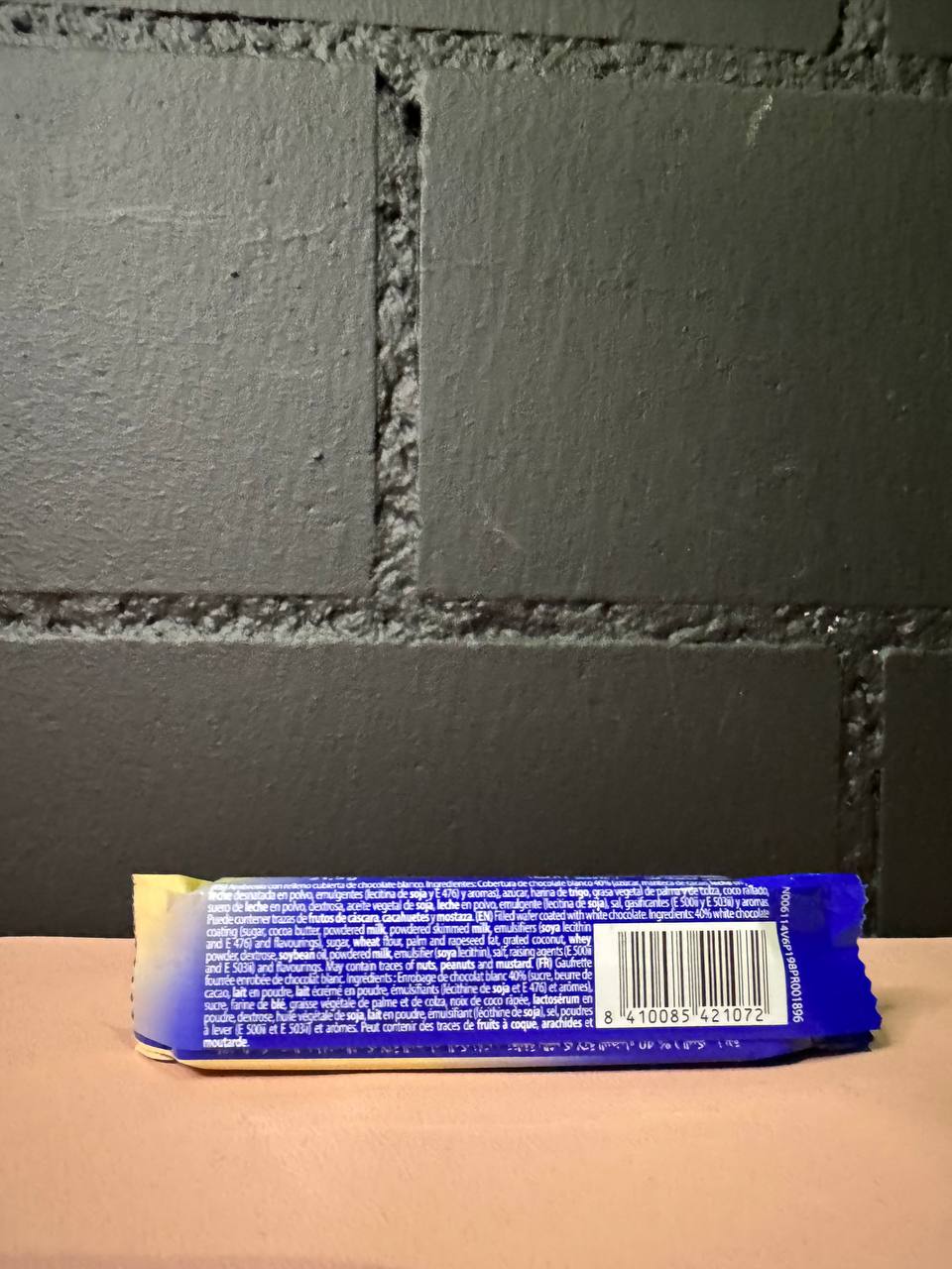 Zutaten: 40 % weiße Schokoladenkuvertüre (Zucker, Kakaobutter, Milchpulver, Magermilchpulver, Emulgatoren (Sojalecithin und E 476) und Aromen), Zucker, Weizenmehl, Palm- und Rapsfett, Kokosraspeln, Molkenpulver, Dextrose, Sojaöl, Milchpulver, Emulgator (Sojalecithin), Salz, Backtriebmittel (E 500ii und E 503ii) und Aromen. Kann Spuren von Erdnüssen, Nüssen und Senf enthalten.